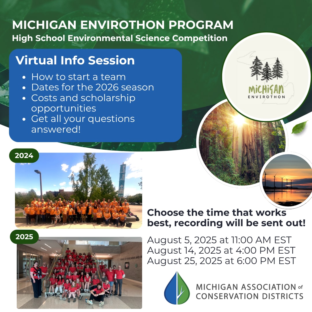 We’re excited to invite you to join the Michigan Association of Conservation Districts (MACD) and the Michigan Envirothon team for an upcoming informational webinar! Whether you’re a returning advisor or new to Envirothon, this is a great opportunity to learn more about the program, updates for the upcoming season, and how you and your students can get involved.