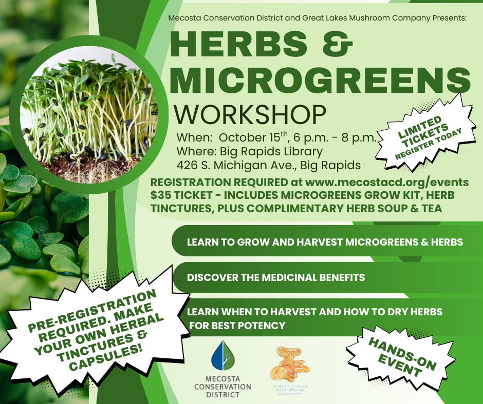 Join Mecosta CD and Great Lakes Mushroom Company for an unforgettable evening on October 15, 2025, at 6:00 PM as they dive into the healing power of herbs and microgreens in this hands-on, knowledge-packed workshop! This exciting opportunity will guide you through the medicinal benefits, growing techniques, and real-world applications of some of nature’s most powerful plants. This isn't just a class, it's a full experience designed to teach, taste, and transform your understanding of plant-based wellness!